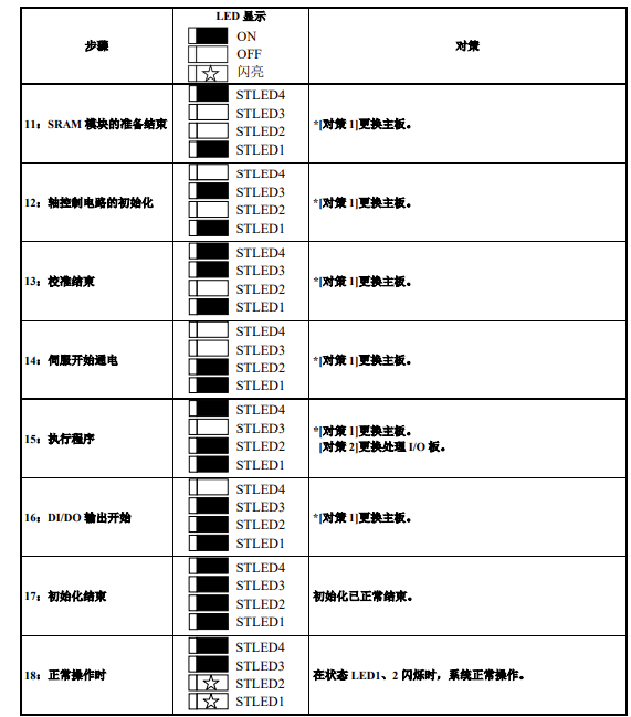 接通電源時(shí),在示教器可以顯示之前發(fā)生的報(bào)警,通過(guò)主板的狀態(tài)顯示LED(綠色)的點(diǎn)亮狀態(tài)進(jìn)行判斷。在機(jī)器人正常動(dòng)作中的狀態(tài)下,